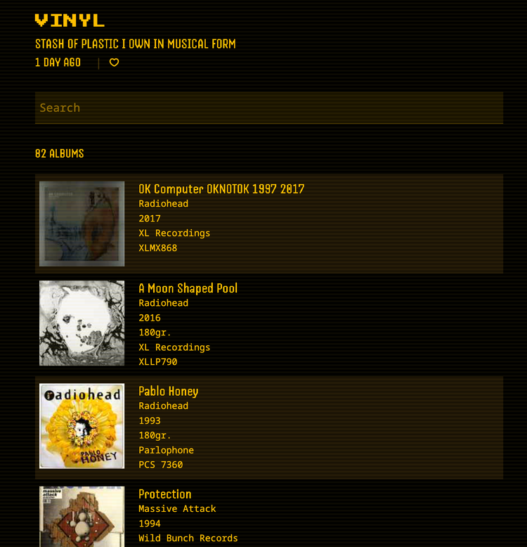 And finally, the catalog itself: another Worker with cache glued to the Discogs API.